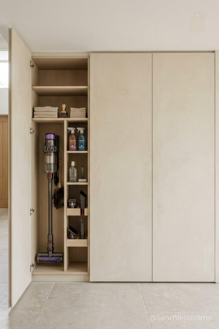 Integrated system provides complete concealment for vacuums and supplies, ensuring your utility space remains a sanctuary of order.